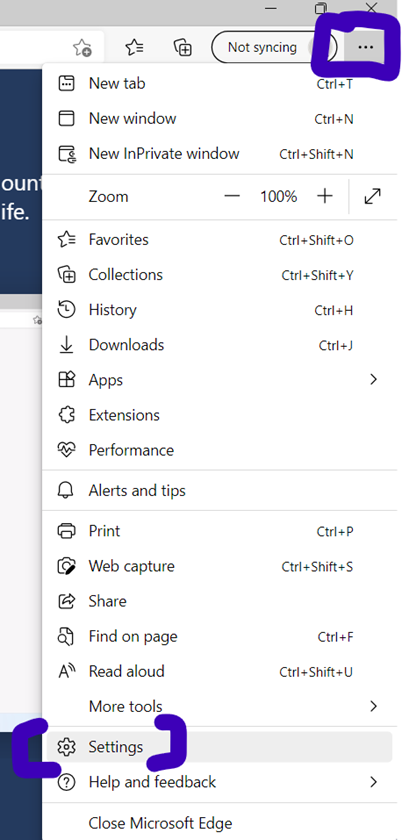 Click the ‘three dots’ in the top right corner of Edge, then click “settings” at the bottom.